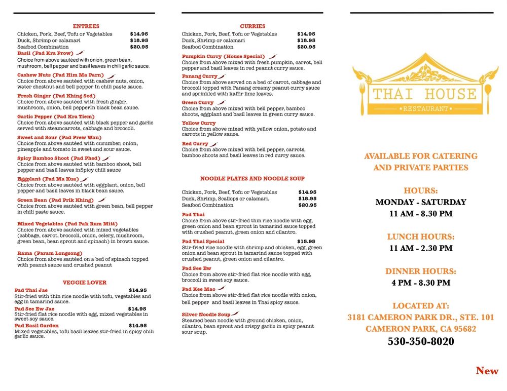 Introducing Thai House, a veteran-owned restaurant in Cameron Park, CA, known for its authentic Thai cuisine. Offering a variety of vegan and limited vegetarian options, this casual spot has something for everyone. The menu features dishes like crispy chicken wings, flavorful Pad Thai with crispy duck, and delicious pumpkin curry. The ambiance is cozy with occasional piano music, adding to the dining experience. Customers rave about the attentive service and high-quality meals, praising the owner, Robert, for his commitment to serving the community. Standout dishes include pineapple rice, Thai coconut soup, and the aromatic basil chicken. Whether you're a fan of spicy or milder flavors, Thai House delivers on taste and quality. Don't miss out on this hidden gem in Cameron Park.